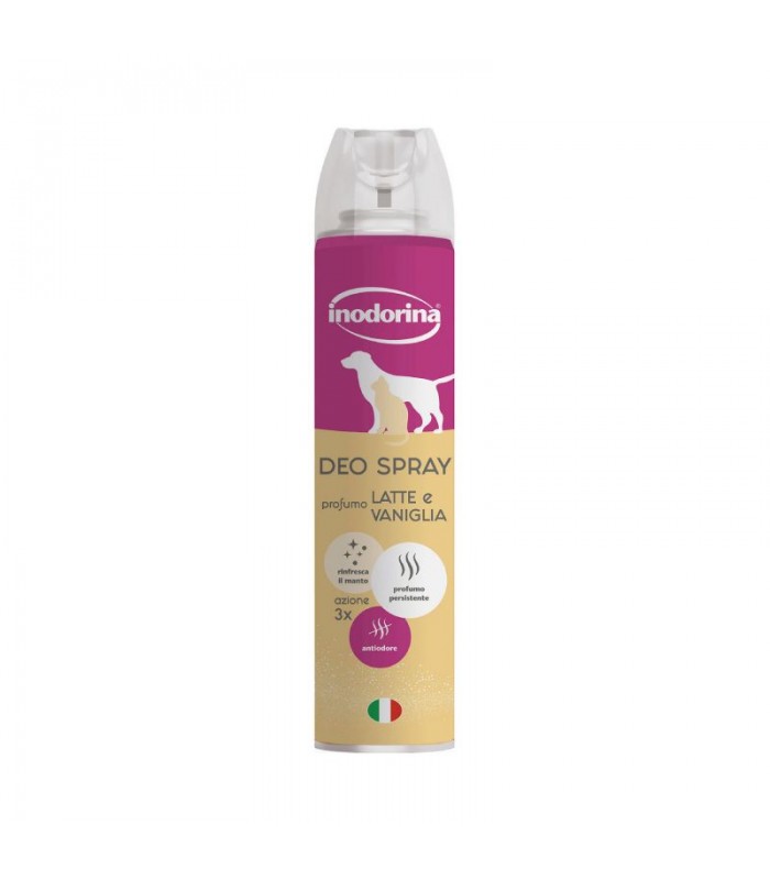 Inodorina Deo Spray Leche y Vainilla 300ml es una solución rápida y eficaz para refrescar e higienizar el pelaje de nuestro perro. Gracias a su formulación específica, neutraliza cualquier olor desagradable y desodoriza, protegiendo el pelaje de los agentes atmosféricos.